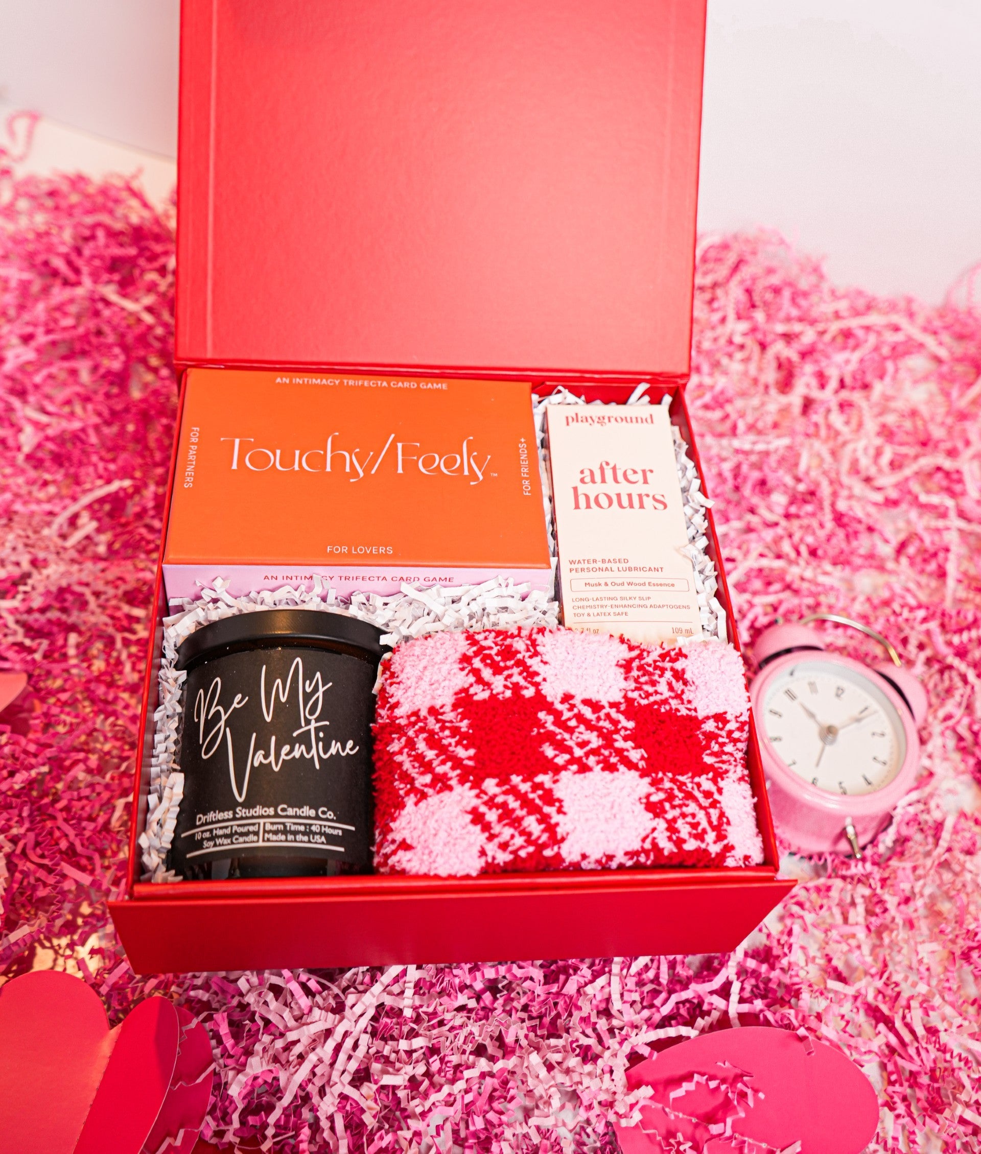 This luxurious set includes conversation cards to spark meaningful dialogue, a sensual Be My Valentine candle to set the mood, premium water-based lubricant for comfort and pleasure, cozy fuzzy socks for relaxation, and elegant packaging in a magnetic box.